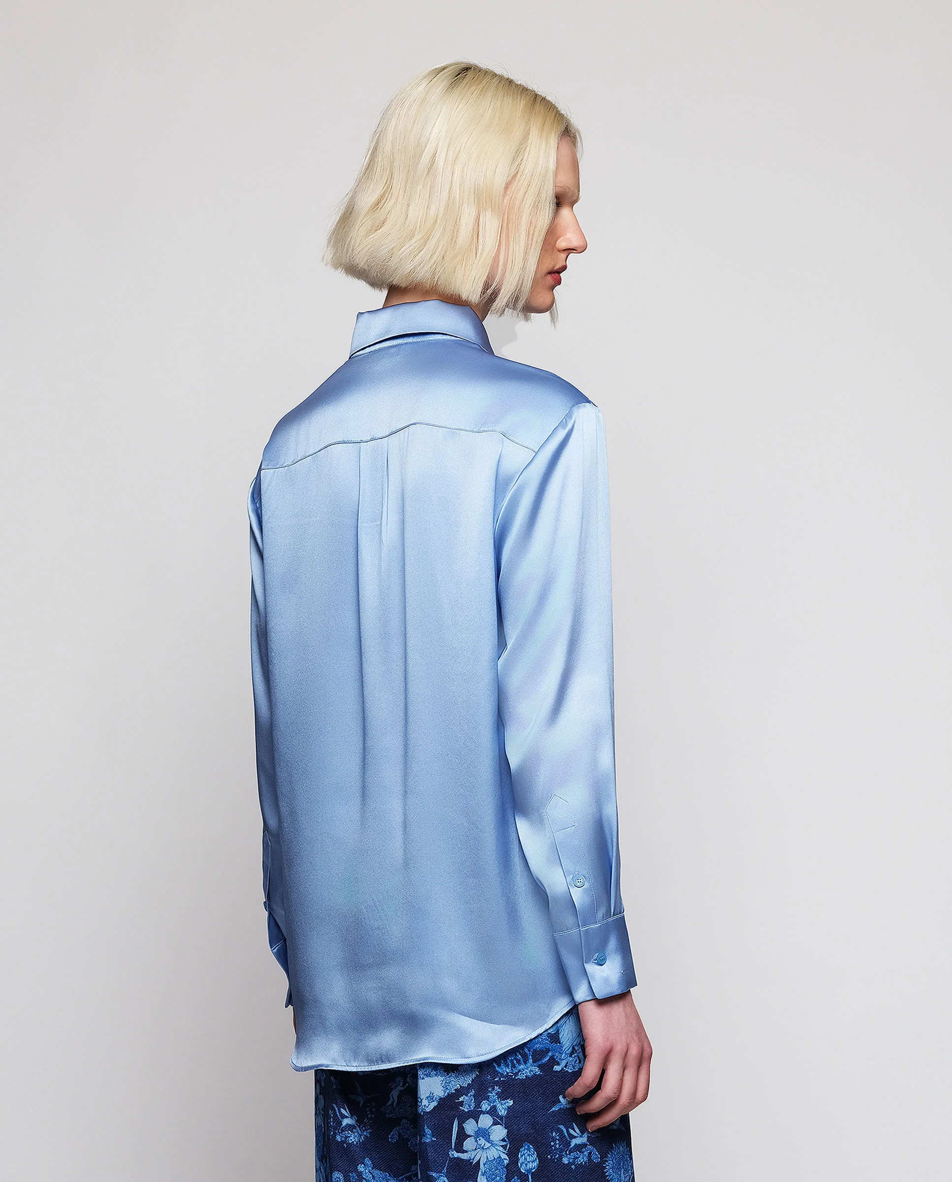 Blusa azul de seda 100%. Cuello camisero, cierre central oculto con botones y manga larga con puños. Fit recto. Una blusa vital donde el color, el tejido y los acabados depurados definen el refinamiento y la elegancia atemporal.